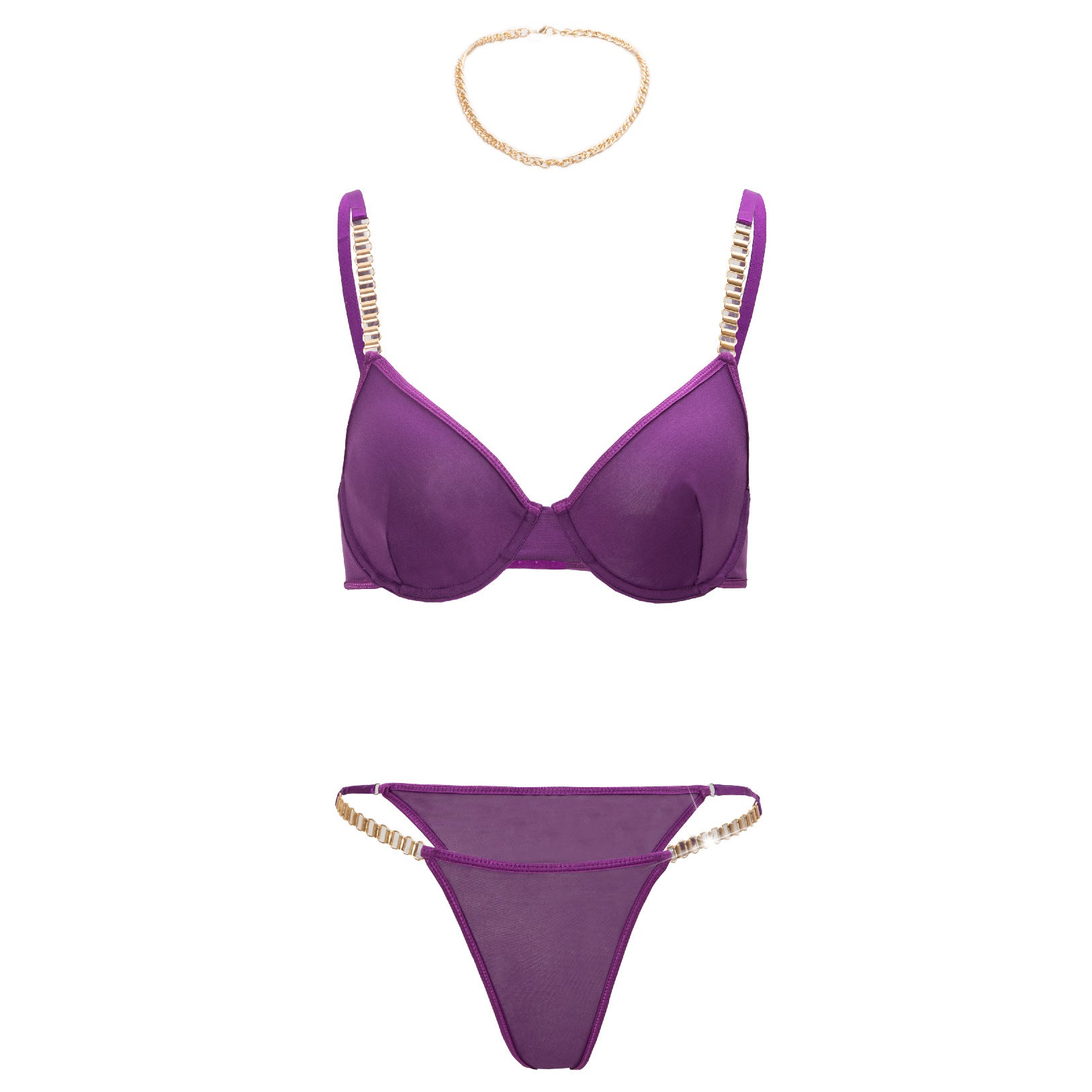 The Silver Rush Mesh & Chain Bra Set is bold, seductive, and unapologetically confident. Crafted from breathable 80–90% mesh polyester, its 3/4 molded cups and double straps lift and flatter, while the chain accents add a spark of drama. The secure double-row hooks promise a perfect fit, so you can move with ease—and allure.